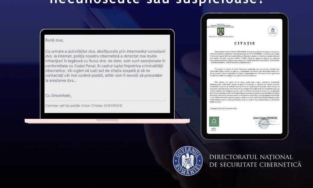 Directoratul Național de Securitate Cibernetică atrage atenția asupra mesajelor, link-urilor și documentelor primite din surse necunoscute sau suspicioase. Adesea, infractorii cibernetici se folosesc de imaginea unor autorități pentru a oferi o doză mare de încredere scenariului servit potențialei victime. Astfel, identitatea vizuală corespondentă precum și numele Interpol, Europol, Poliția Română, ANAF sau chiar a DNSC au fost și sunt încă utilizate de atacatori în tentative de fraudă online.