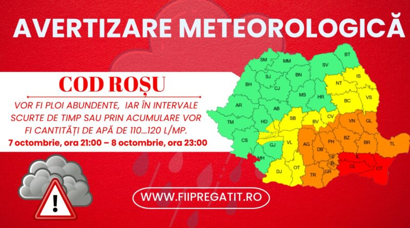 Începând de marți, 7 octombrie, ora 21:00, și până miercuri, 8 octombrie, ora 23:00, județul Constanța intră sub incidența unui cod roșu de vreme severă. Sunt prognozate ploi abundente, cu acumulări ce pot depăși 110–120 l/mp. Inspectoratul pentru Situații de Urgență „Dobrogea” a activat măsuri speciale pentru a gestiona riscurile și intervențiile posibile.