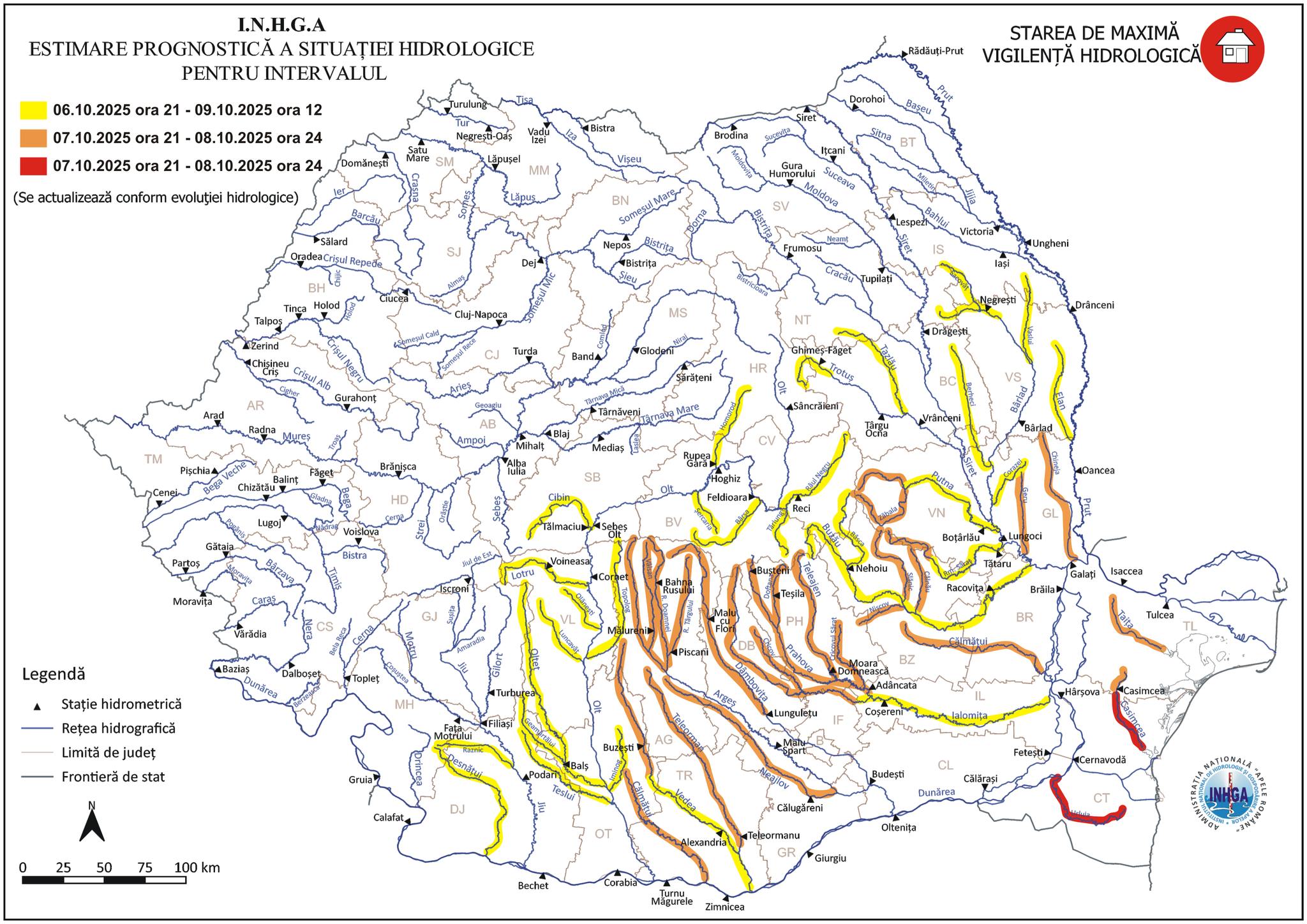 Comitetul Județean pentru Situații de Urgență Constanța anunță că județul se află sub atenționare hidrologică de cod galben și avertizare hidrologică de cod roșu, emise de Institutul Național de Hidrologie și Gospodărire a Apelor.