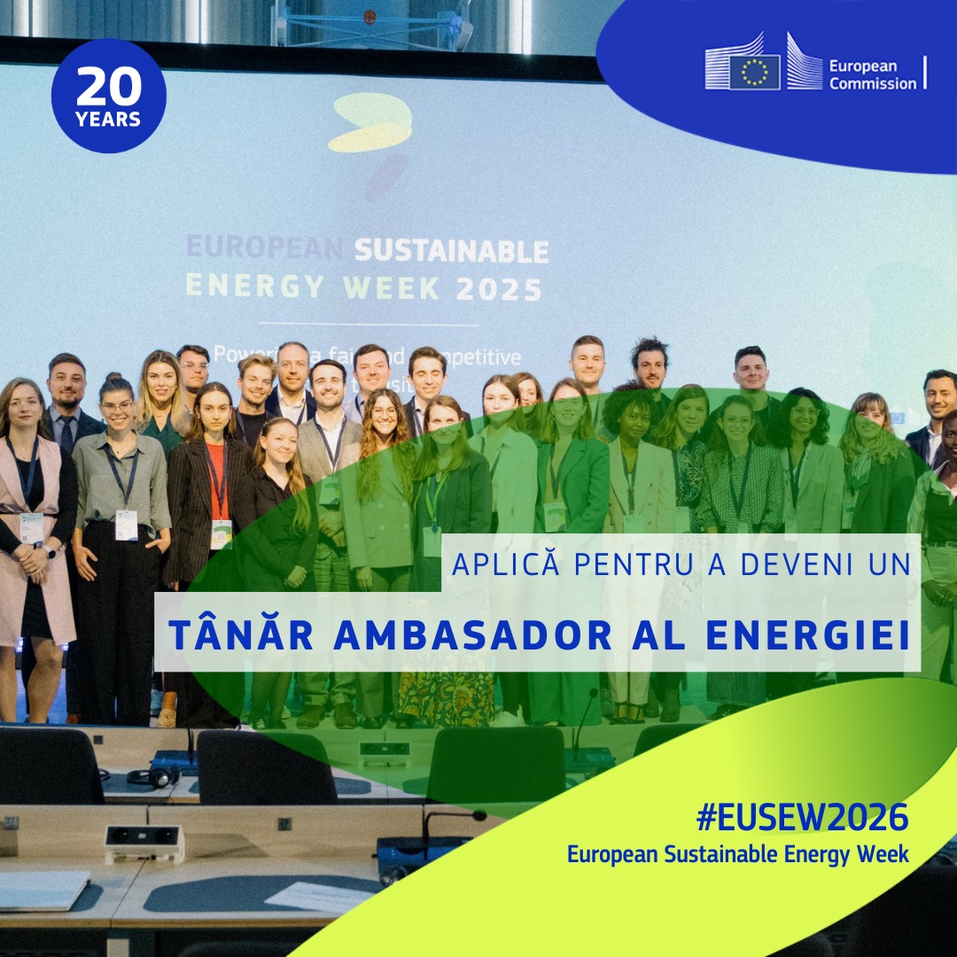 Comisia Europeană a anunțat deschiderea înscrierilor pentru programul „Tineri Ambasadori ai Energiei”, desfășurat în cadrul Săptămânii Europene a Energiei Durabile (European Sustainable Energy Week – EUSEW) 2026.