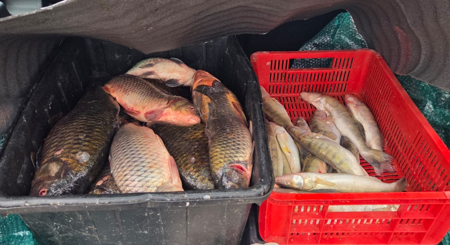 În portbagajul autoturismului au fost găsite 3 lăzi cu peste 100 kg de pește, din speciile crap, șalău și somn. Persoanele nu dețineau documente de proveniență și nici autorizație pentru comercializare, iar o parte din pește prezenta semne de alterare.