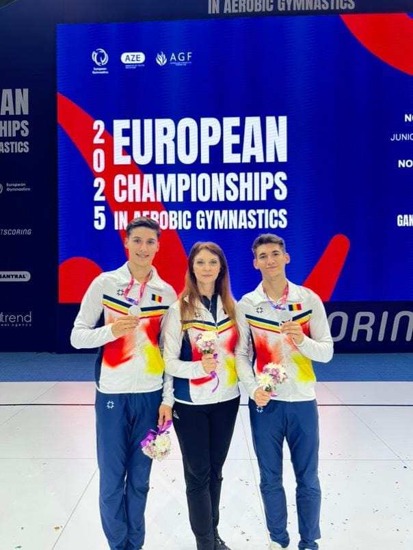 România a cucerit medalia de argint în proba pe echipe, sâmbătă, la Campionatele Europene de gimnastică aerobică pentru seniori, desfășurate la Ganja, în Azerbaidjan.